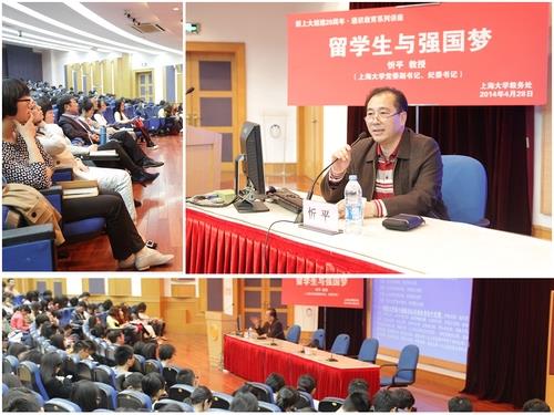 留学生与强国梦,这是值得我们每个人深思的话题。本场报告会是教务处为迎接新上大组建20周年带给大类学生的一场通识教育讲座。本次讲座让同学们重新思考自己肩上的责任与担当。人文大类14班周师炜同学感慨,“通过这次讲座,同学们对留学有了更深的理解,强烈的留学欲望在一些同学心里滋长,并燃烧起他们心中的学习劲儿。忻平老师结合浓浓的历史元素,使我们充分了解我国留学生近年来的发展与成就,并介绍了留学生与各国的联系、对各国的看法,让预备留学的同学有了一定的目标与框架。”