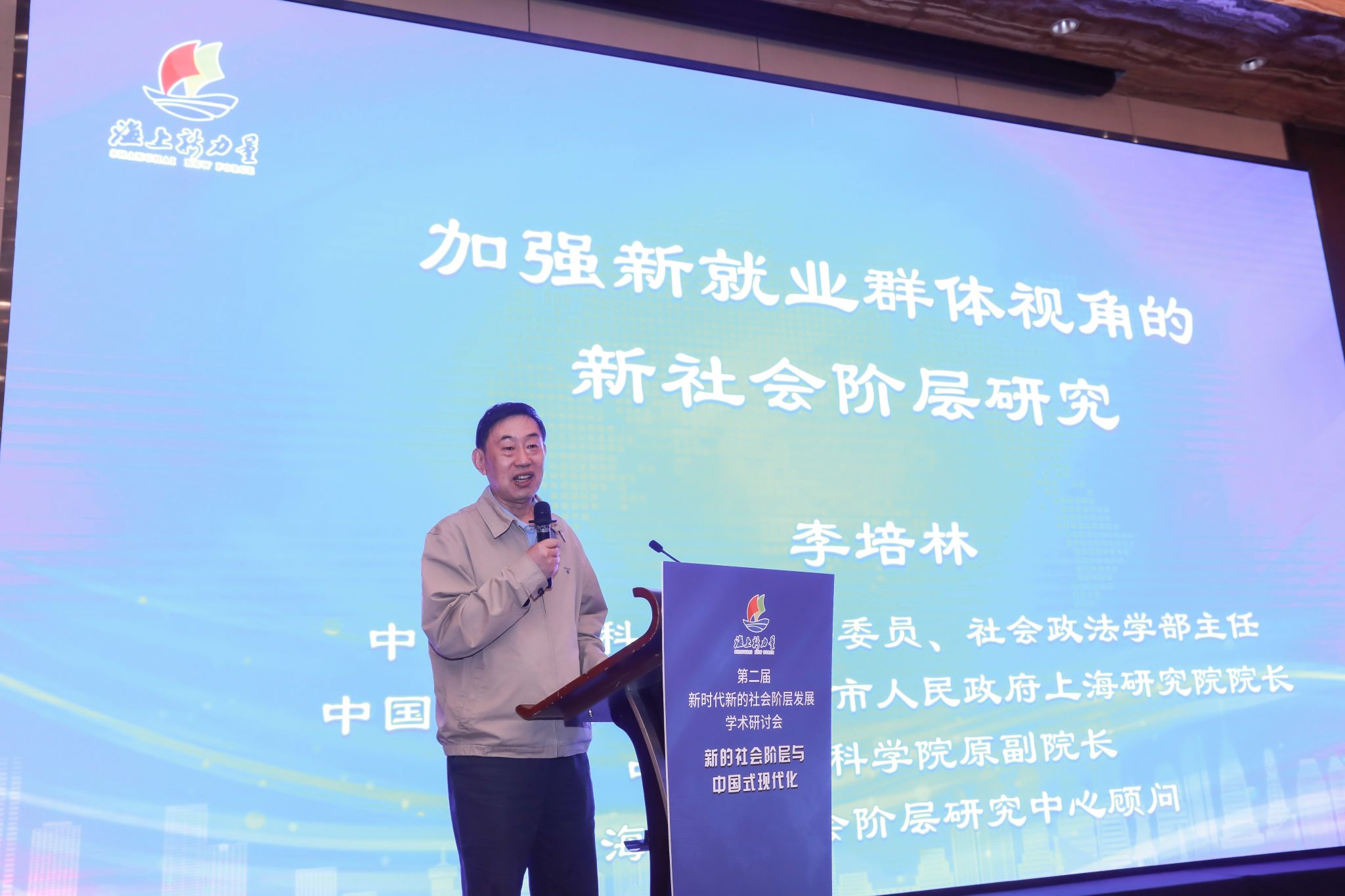 在主旨演讲环节,中国社会科学院学部委员、社会政法学部主任、中国社会科学院-上海市人民政府上海研究院院长、中国社会科学院原副院长、上海新的社会阶层研究中心顾问李培林研究员以“加强新就业群体视角的新社会阶层研究”为主题发表了演讲,他提出加强新就业群体视角的新社会阶层研究是中国式现代化的中国之问、时代之问,并在高度概括“新就业群体”五大特征的基础上提出了加强新就业群体视角的新社会阶层研究的具体内容。中国社会科学院社会发展战略研究院院长、全国人大社会建设委员会委员、中国社会学会副会长、上海新的社会阶层研究中心专家张翼研究员围绕新社会阶层及其发展趋势作了精彩发言。吉林大学教授、中国社会学会学术委员会副主任委员、社会变迁研究会副会长、吉林大学原常务副校长邴正教授在主旨演讲中对推进城乡融合与区域协调发展的历史任务进行了深刻解读,并结合新社会阶层的特点提出了参与推动东北实现城乡融合和区域协调发展的建议。中国人民大学社会学理论与方法研究中心教授、安徽大学讲席教授刘少杰以“信息技术革命推动的新社会阶层地位变迁”为题发表了主旨演讲,他认为应当根据信息技术的使用权研判新社会阶层的社会地位,新社会阶层不仅是先进生产力的主要构成,而且是推进社会发展的基础。全国新的社会阶层人士服务团自由职业三分团负责人、上海市政协常委、文卫体委员会副主任陈海波就新时代文化统战在调动新的社会阶层人士积极性方面的重要作用,并结合具体实践活动阐释了如何以文化统战调动新的社会阶层人士的积极性。